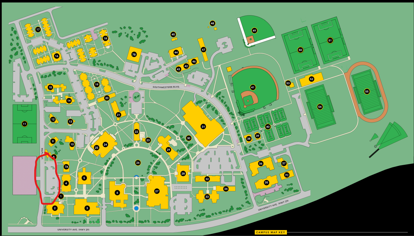 Park in the Cullen Parking Lot (circled in above in red). When you turn onto Maple Street off University Ave, it is the first parking lot on your right. We’ll all meet there!